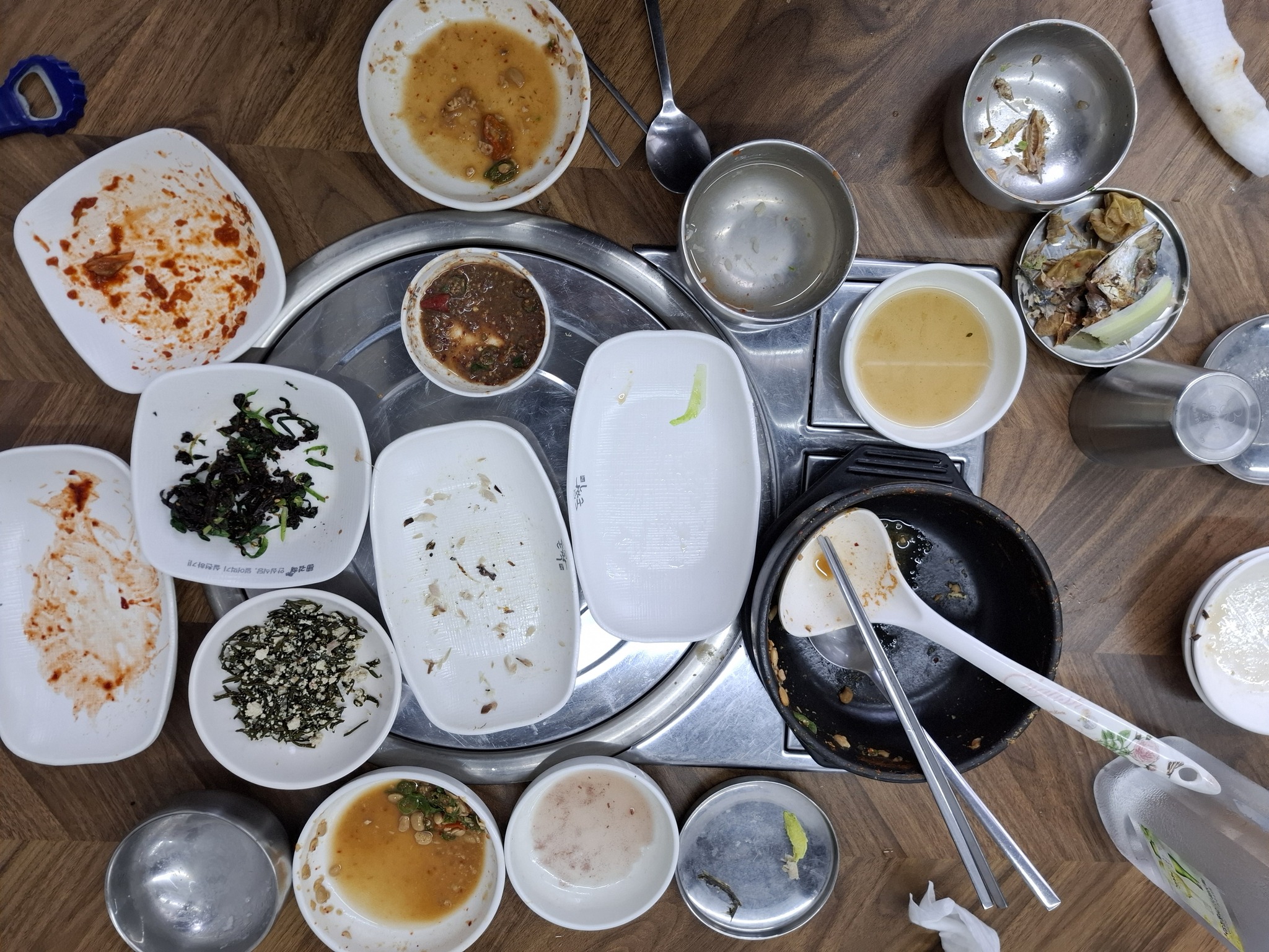 그래서 밥과 반찬을 이렇게 깨끗하게 해치울 수 있었다. 물론 남긴 것도 있다. 톳을 비롯한 바다풀 나물 둘과 고등어 찍어먹는 멸치젓갈 하나는 다 먹지 못했다. 맛이 없어서가 아니라 주인아주머니 손이 커서 많이 주셨기 때문이다.
