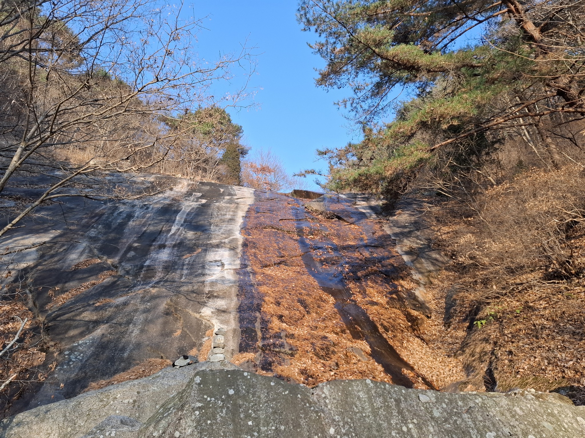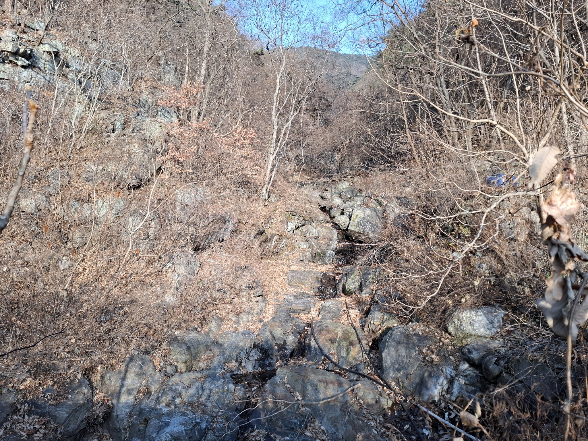 여기에서는 날이 맑기만 하면 오전이든 오후에든 햇볕을 등에 지고 품에 안을 수 있어서 좋다. 또 경치도 그럴듯해서 물이 흘러내리는 조그만 골짜기와 엄청 커다란 암벽을 눈에 담을 수 있는데 이것은 덤이다.